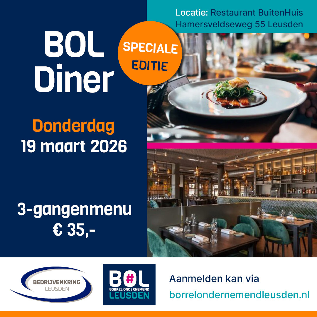 Op donderdag 19 maart, hebben we geen gewone BOL, maar hebben we het BOL Diner. Gezellig samen een hapje eten, mensen ontmoeten en bijpraten met andere ondernemende Leusdenaren.